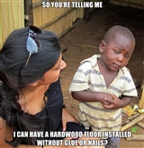 so we are ready to put the floor down! I’m going to assume that we are putting this floor down over concrete and talk about three methods of installation. The first method is a direct glue down. This also assumes that the moisture test has been done and there is zero indication of ANY concrete vapor emissions what so ever. Two things to keep in mind here – just because your slab looks flat doesnt mean that it is flat. The first thing a good installer will do is to take a ten ft straight edge and lay it across every part of the subfloor, marking off where there are dips and high points. He is then going to come to you and tell you that there needs to be some self leveling compound poured down to make the floor level. I get it – this is the point where you as the consumer starts thinking “RIP-OFF ALERT!!RIP-OFF ALERT!! This Joker is trying to play me for a sucker!” –Chill out, it’s okay. This is what’s called “unforseen floor prep” and it is going to happen from time to time. An un-level slab will make for a bad install, there is no getting around that. You will have peaking joints, humps and dips, the final install will look like crap and you wont want to pay him. Do not ruin your install by getting cheap on the floor prep, the flatter he makes it, the better its going to look. The second thing to keep in mind is the glue. You want what ever adhesive the manufacturer of the wood tells you to use. Use something else and you void your warranty. Most of the time they are going to tell you to use some type of branded moisture cured urethane adhesive, be sure to get this from your retailer, do not let the installer supply it. When your installer starts be sure he is using the correct trowel – it will say which on the bucket. 2 more tips – Never use a water based adhesive, because it is made with water it is not resistant to water. that’s a bad thing. Second, When he is spreading the glue, leave. Not because of fumes, it is safe, but because the glue itself is not to be trifled with. This glue cures overnight and is literally impossible to remove – seriously, impossible. No one wants this stuff accidentally stepped in and walked all over the house (shudder).
